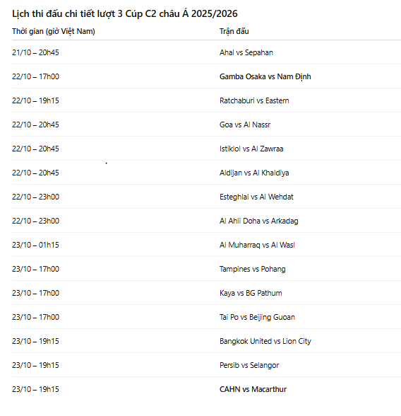 Lịch thi đấu chi tiết lượt 3 Cúp C2 châu Á 2025/2026