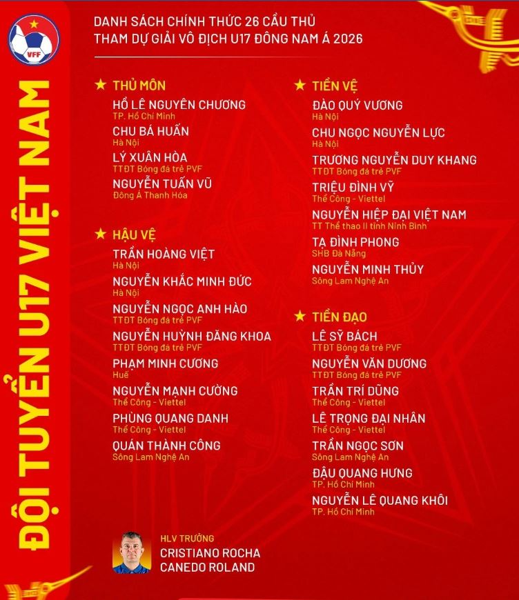 U17 Việt Nam đã chính thức công bố danh sách 26 cầu thủ tham dự U17 Đông Nam Á 2026. Điểm nhấn đáng chú ý là sự góp mặt của tiền đạo Nguyễn Lê Quang Khôi – con trai của cựu tuyển thủ Nguyễn Quang Hải, người từng cùng ĐT Việt Nam vô địch AFF Cup 2008.
