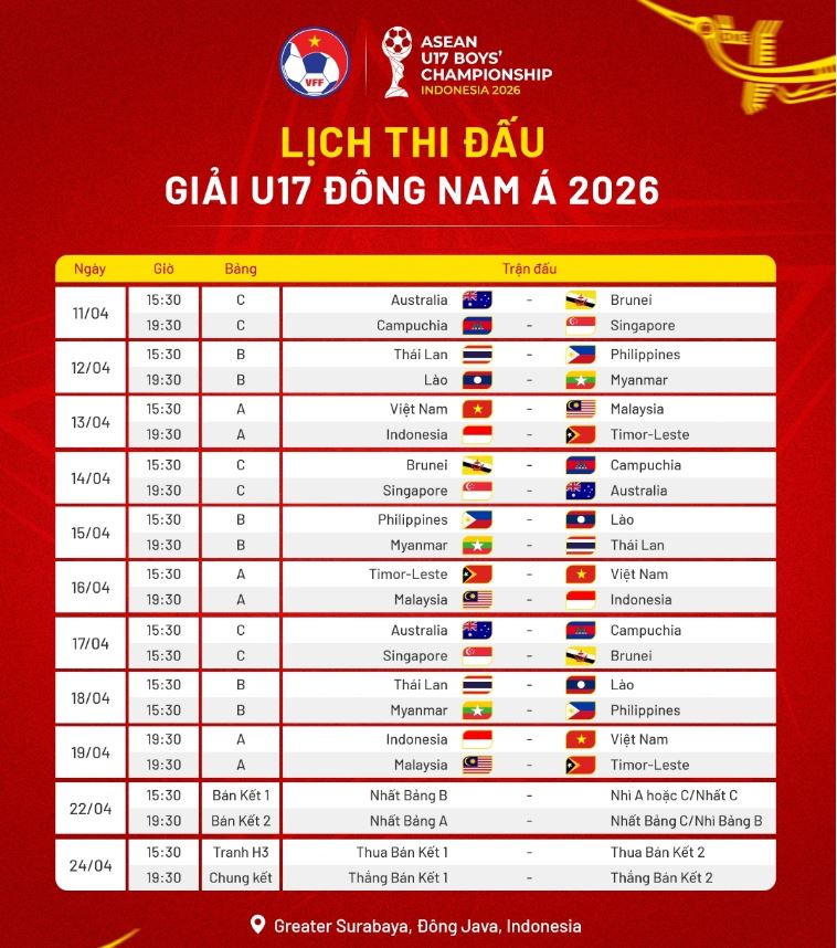 Giải U17 Đông Nam Á 2026 diễn ra từ 11/4 đến 23/4 tại Indonesia.
